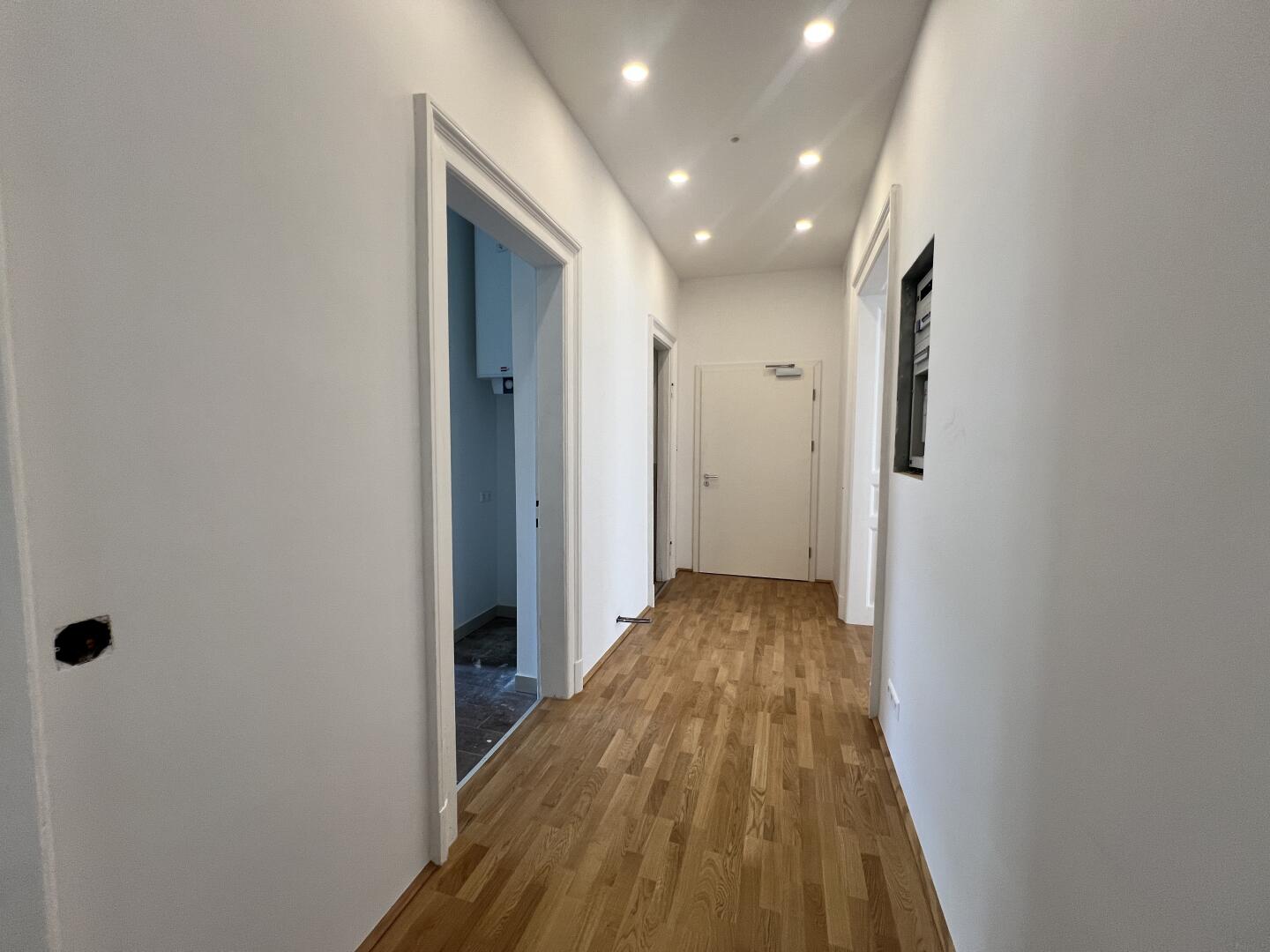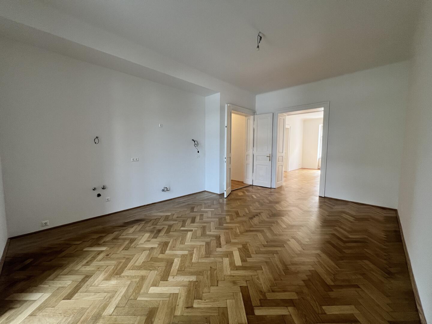 Vorraum, Luxus Badezimmer mit Eckbadewanne, Dusche, WM-Anschluss und Zugang zum Balkon, extra WC, 2 wundervolle Altbau Zimmer (tolle Raumhöhe, Parkettboden), geräumiger Küchenraum (in Nische möglich, unmöbliert) mit zusätzlichem Zugang zum Balkon, neu errichteter Balkon (Innenhofseitig), Kellerabteil.