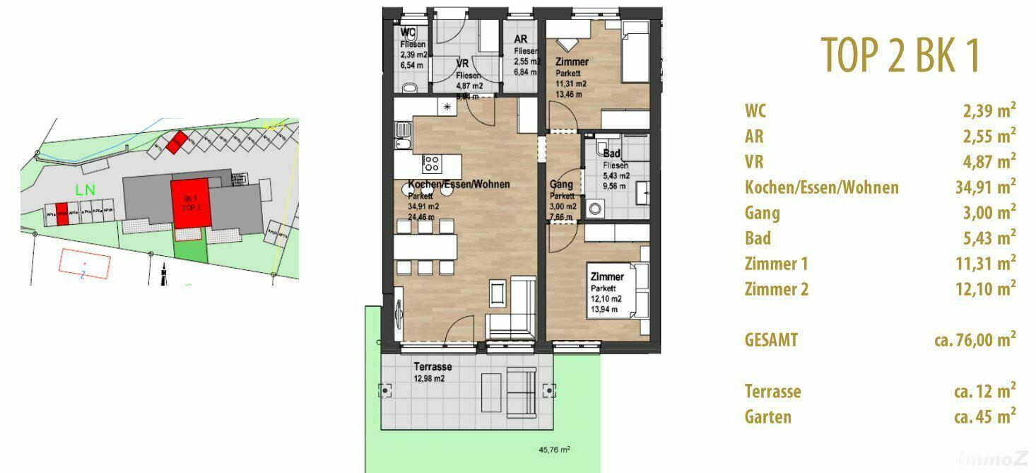 | Kurzinfo: | ? Neubauwohnung in kleiner Anlage mit nur 6 Einheiten ? Erster und letzter Stock ? Ca. 76 m² Wohnfläche mit durchdachtem, offener Grundriss ? Zwei getrennt begehbare Schlafzimmer (ca. 11,3 m² & 12 m²) ? Große ca. 12 m² Terrasse & ca. 46m² Eigengarten ? Separates Bad und WC für mehr Komfort ? Carport- und/ oder Autoabstellplatz im Freien möglich ? Ziegelmassivbauweise mit hochwertigen Wienerberger Ziegeln ? Fußbodenheizung mit energieeffizienter Luftwärmepumpe ? Hochwertiger Eichenparkettboden (Weitzer Parkett) ? Kunststofffenster mit 3-fach-Verglasung und Helopal-Fensterbänken ? Elektrische Rollos als Sonnenschutz ? Kalkputz in Nassräumen und glatter Gipsputz in Wohnräumen ? Satteldach mit klassischer Ziegeleindeckung und vieles mehr ....! |