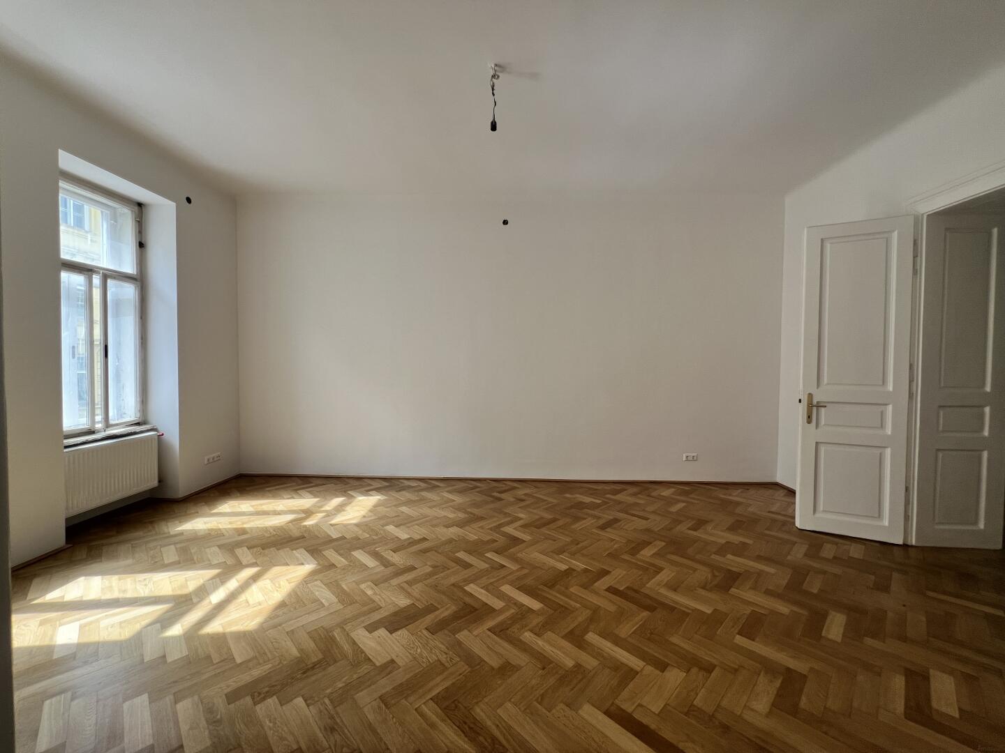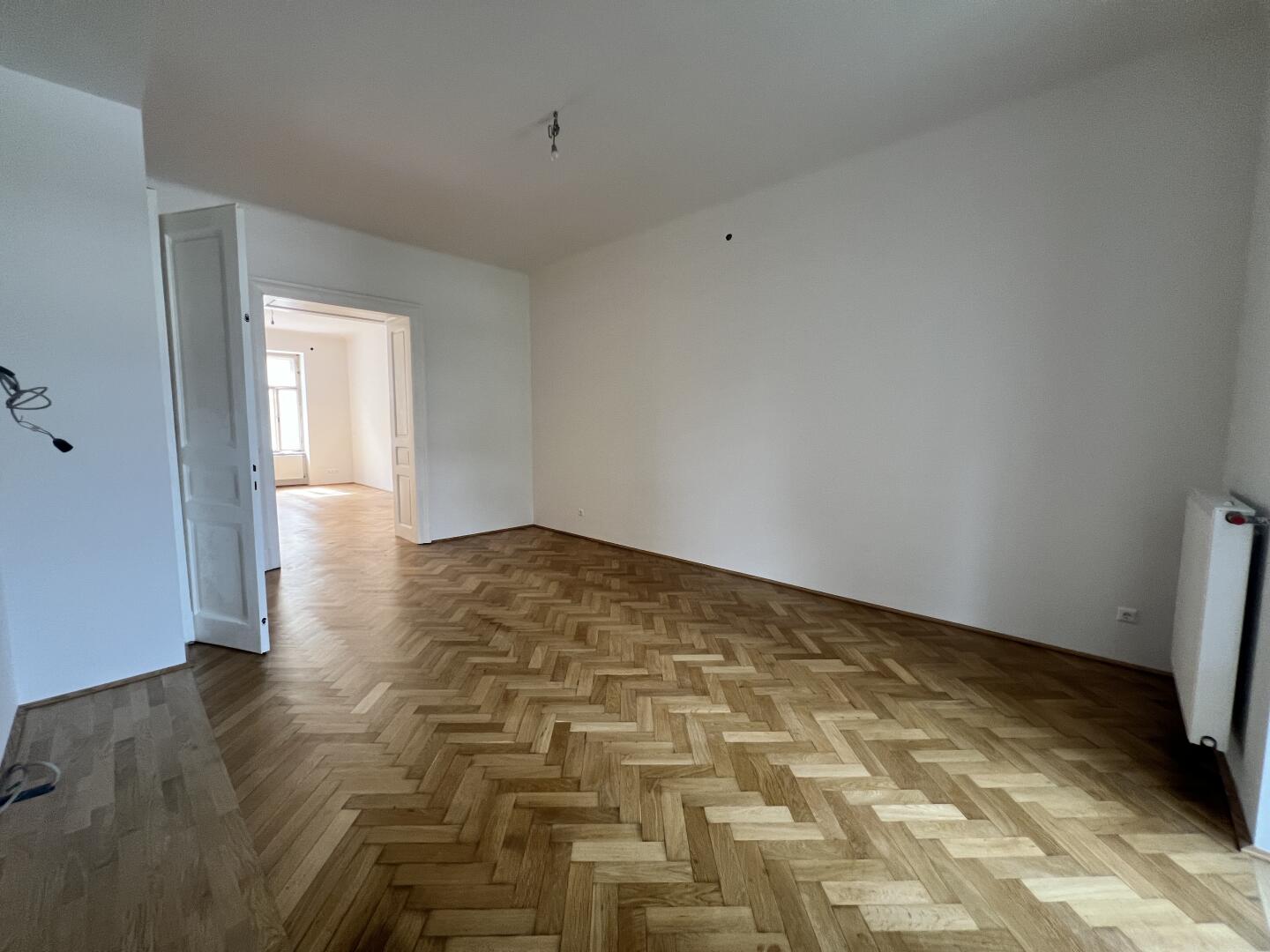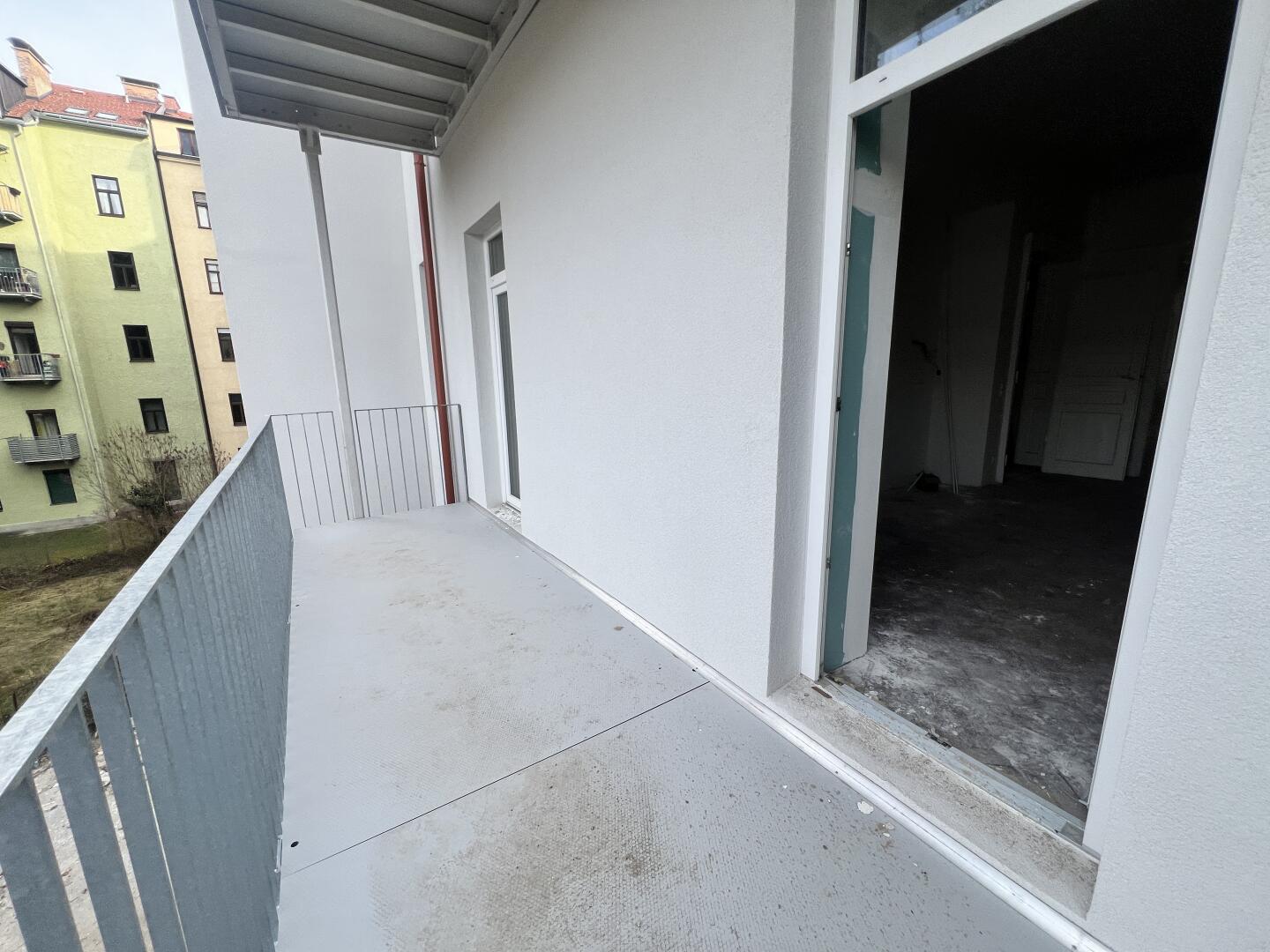 Vorraum, Luxus Badezimmer mit Eckbadewanne, Dusche, WM-Anschluss und Zugang zum Balkon, extra WC, 2 wundervolle Altbau Zimmer (tolle Raumhöhe, Parkettboden), geräumiger Küchenraum (in Nische möglich, unmöbliert) mit zusätzlichem Zugang zum Balkon, neu errichteter Balkon (Innenhofseitig), Kellerabteil.