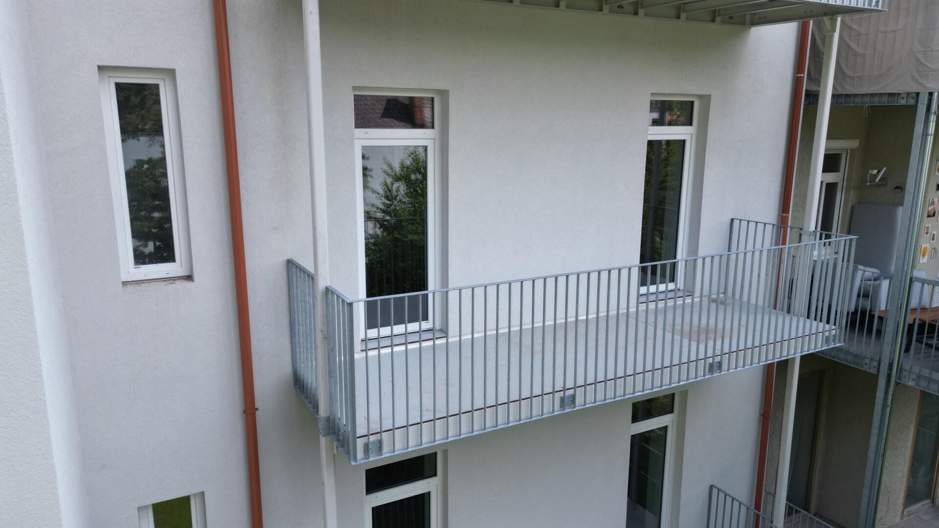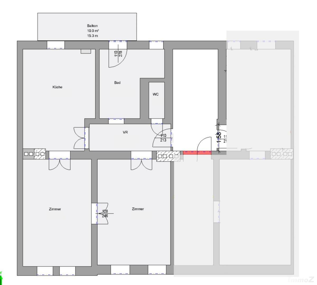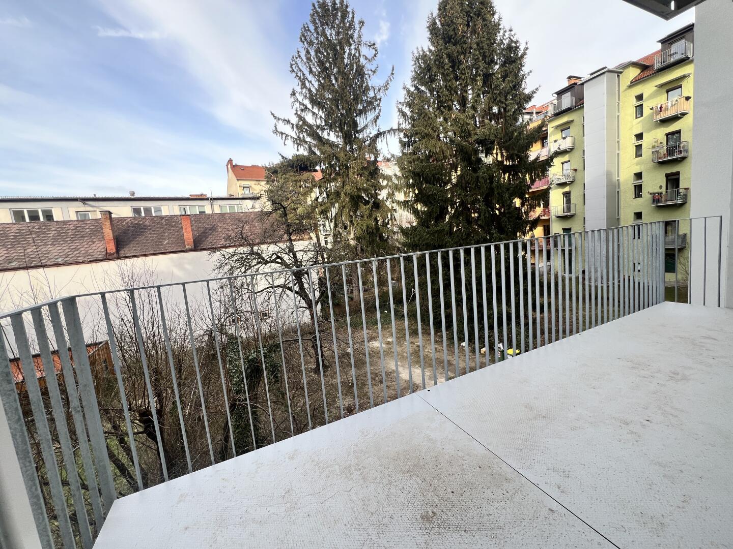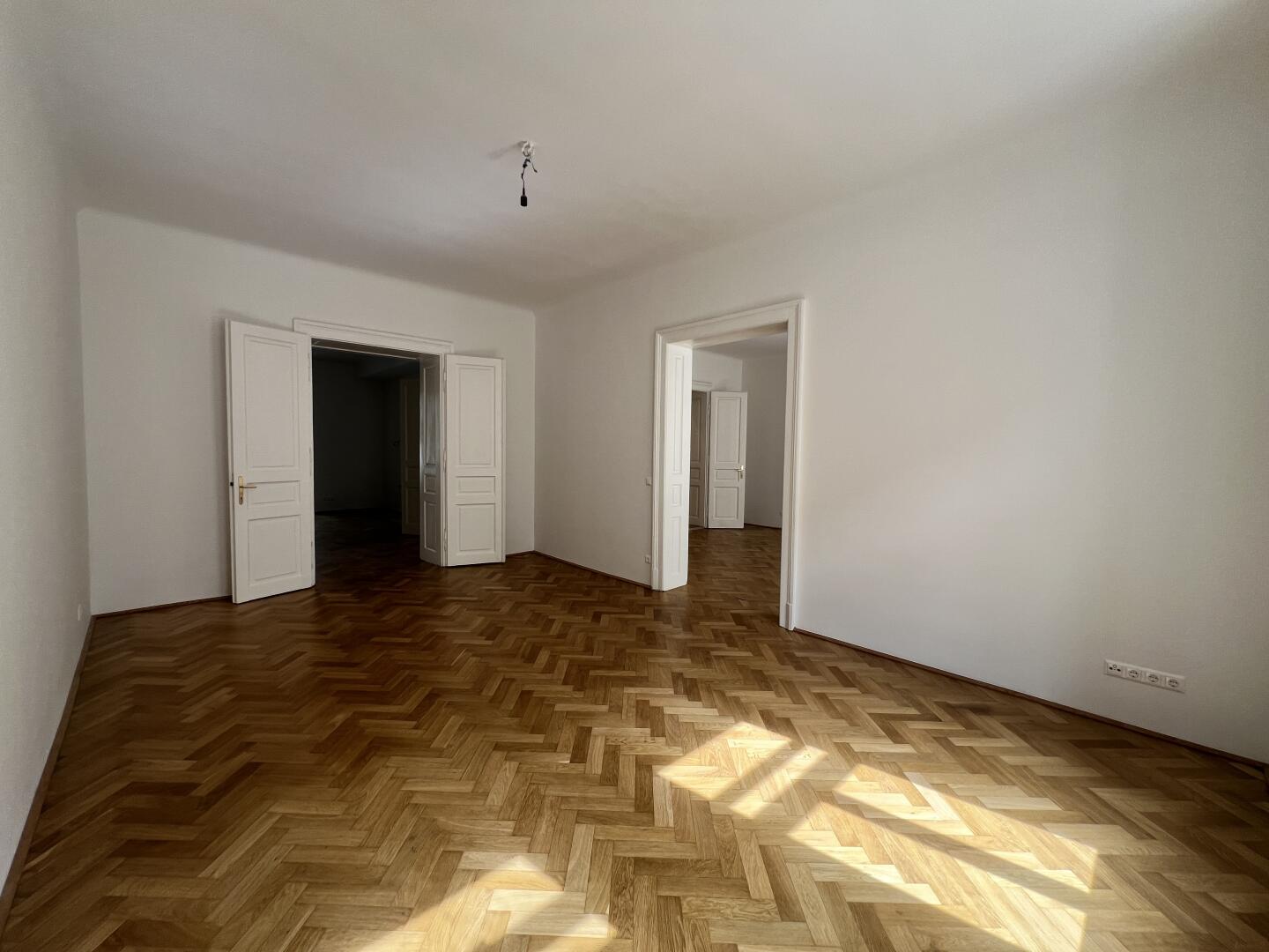 Vorraum, Luxus Badezimmer mit Eckbadewanne, Dusche, WM-Anschluss und Zugang zum Balkon, extra WC, 2 wundervolle Altbau Zimmer (tolle Raumhöhe, Parkettboden), geräumiger Küchenraum (in Nische möglich, unmöbliert) mit zusätzlichem Zugang zum Balkon, neu errichteter Balkon (Innenhofseitig), Kellerabteil.