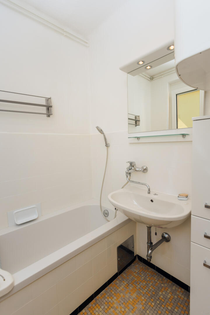 Badezimmer mit Wanne, Waschbecken und Fenster. WC getrennt.