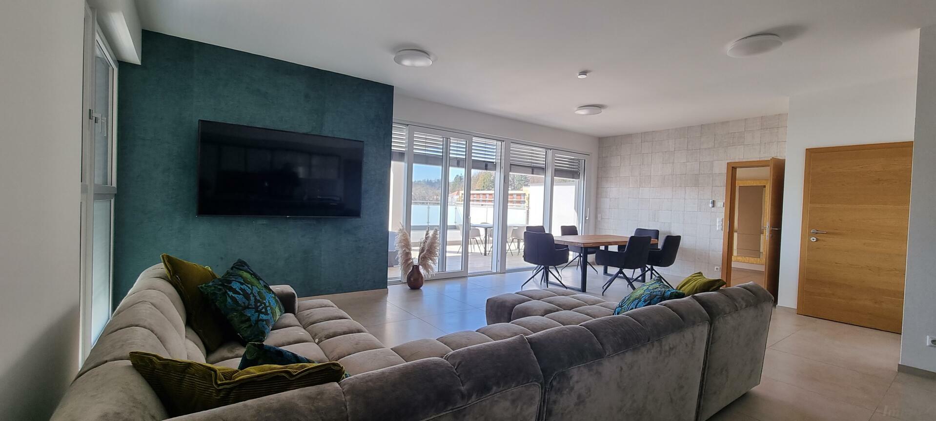 Eine moderne Markenküche samt Kochinsel und viel Stauraum erfreut den (Hobby-?) Koch, eine großzügige Couchgarnitur, ein Großbildfernseher und eine Esstischgarnitur bieten auch Platz für einige Gäste, welche man aber im Sommer auch auf der teilweise überdachten Dachterrasse bewirten kann (ebenfalls Esstisch und eine Rattan-Couchgarnitur).