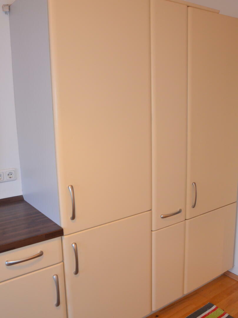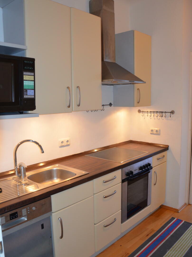 Küche komplett ausgestattet mit sämtlichen E-Geräten, kleinem Eßplatz und kleinem Balkon.